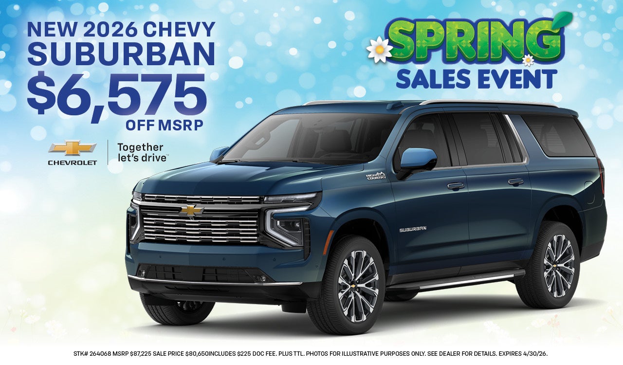 New 2026 Suburban $6,575 Off MSRP – STK# 264068 MSRP $87,225 Sale Price $80,650includes $225 doc fee. Plus TTL. Photos for illustrative purposes only. See dealer for details. Expires 4/30/26.